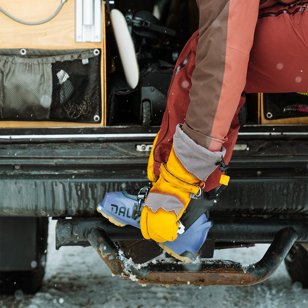 Tip from the Tetons! When removing the gloves, especially during break in, pinch the mitten + index finger to keep the lining in place. It will become easier to take your hand in and out as you break in your split mittens.